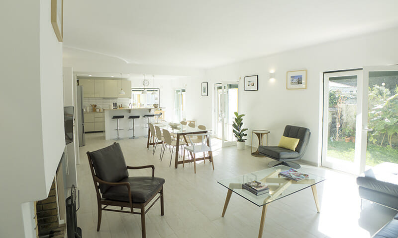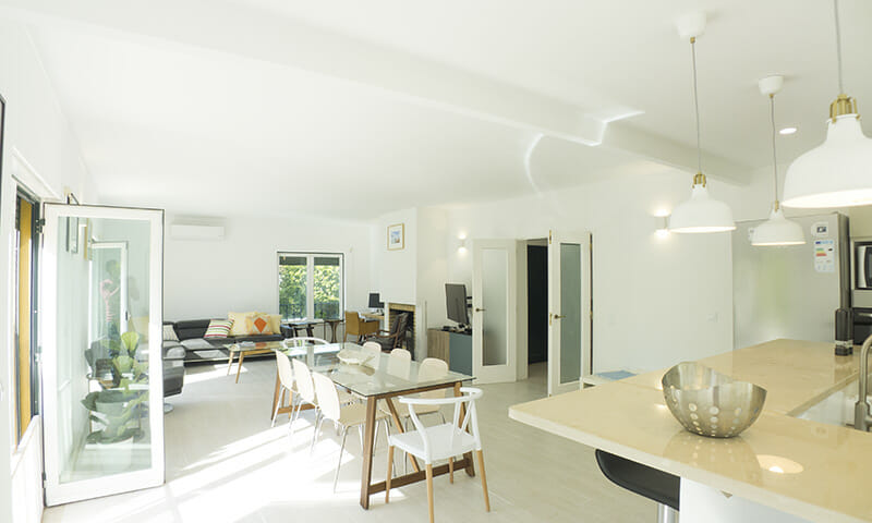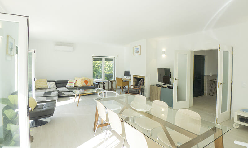 The LV Premier Meco/Albufeira Villas- LA1 vacation rental features a very large living area with spacious kitchenette in one end, the dinning area in the middle and the sitting/TV area at the other end, next to the fireplace. Enjoy free WIFI, and cable TV.