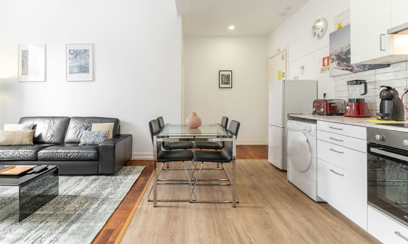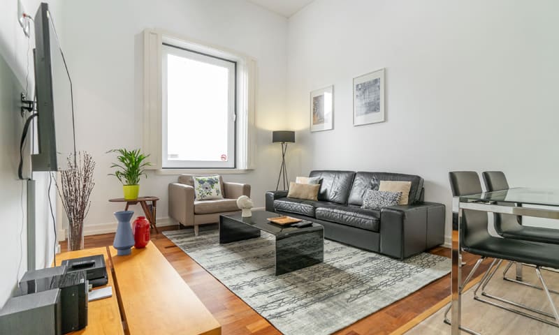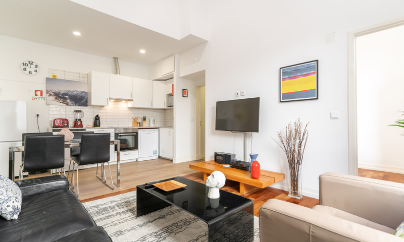 LV Premier Chiado Apartments CH8 is a spacious 2 bedroom and 1 bathroom apartment located in the heart of Lisbon in the fashionable Chiado neighborhood. The apartment was recently remodeled and features a contemporary decoration, neutral accents and accommodates a maximum of 5 people. It has 3 large windows facing a quiet courtyard parallel to bustling Rua do Carmo, leading to the new gardens of Carmo. The apartment has an open living area, with a open kitchen, wide comfortable sitting area with a large TV and dinning area. The bathroom is bright, modern and is equipped with a shower. The building has 2 elevators and has also been built recently and therefore features a fully modern and comfortable layout. AC and heating. This vacation rental apartment is the perfect option to discover Lisboa. Pet Friendly (fee applies). 77835/AL