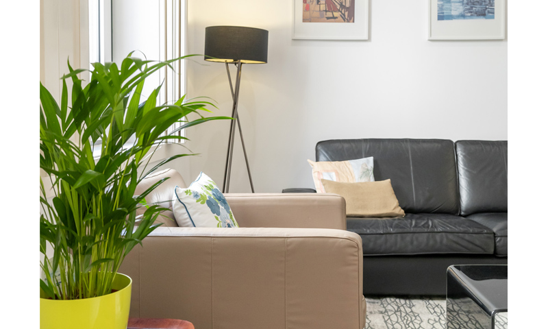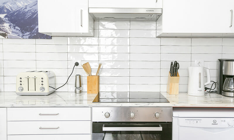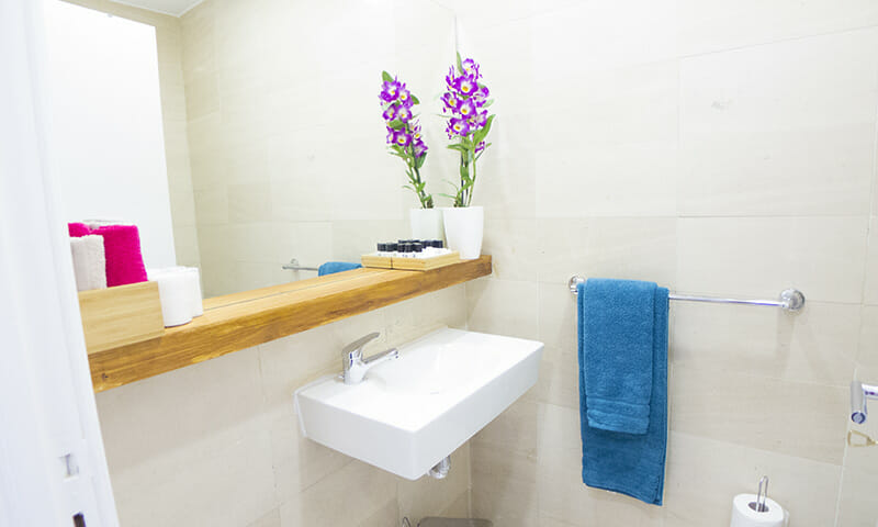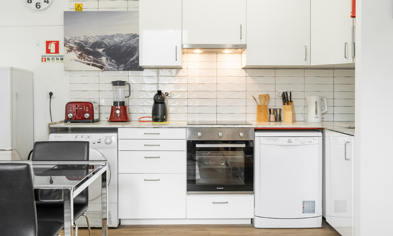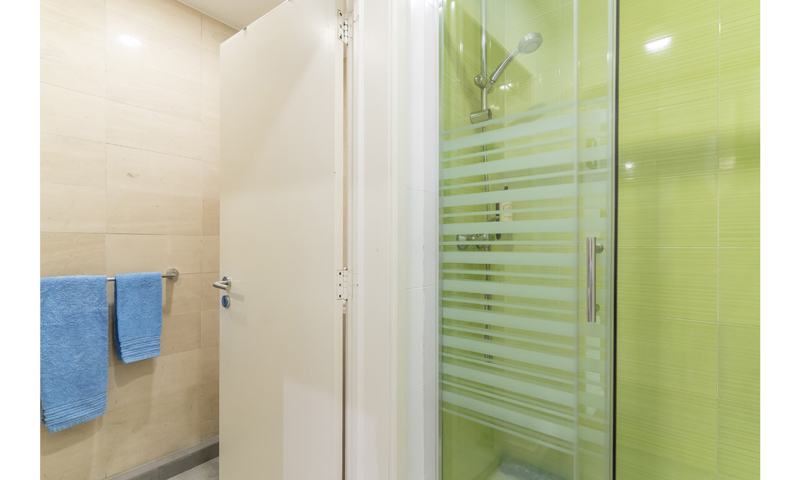 The living area has high ceilings, spacious seating area, comfortable dining area, large TV and large windows. You will find a fully equipped kitchen including all major and small appliances such as – dishwasher, oven, microwave and more. There is also a washing machine and tumble dryer. The bathroom features sandstone interiors, and a shower enclosure. We provide plush bath towels, toiletries for your first day and of course a hair dryer.