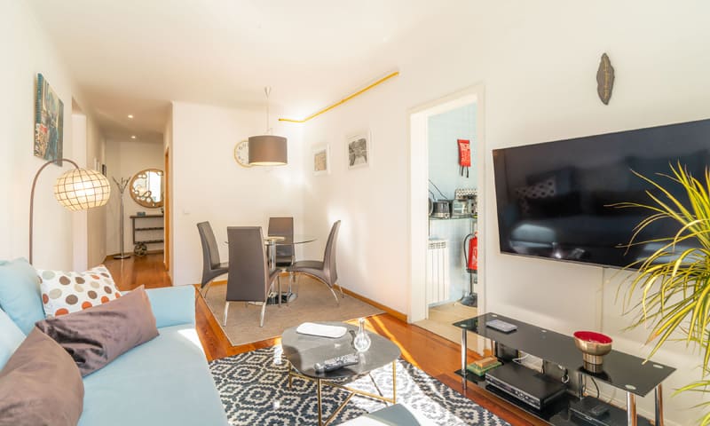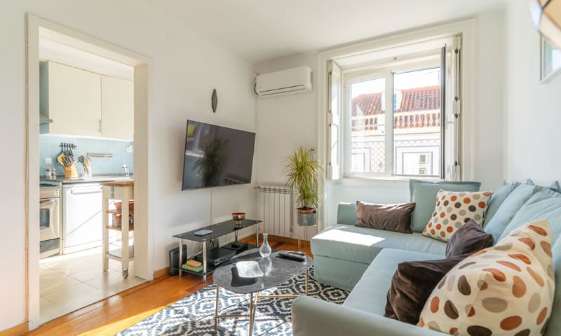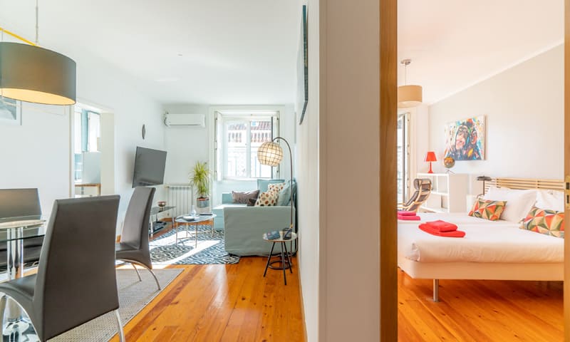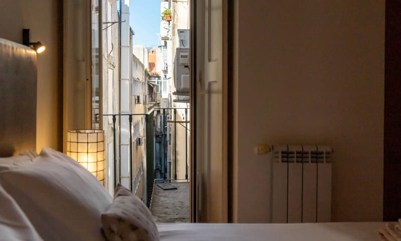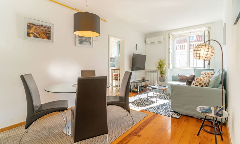 The LV Premier Baixa LisbonSun- PR2 apartment features two bedrooms (both with balcony access), a comfortable living room with dining area, a separate kitchen and a bathroom. Free Wifi and international cable channels are included. Double glazed windows and Air Conditioning/ Central heating will enable you to be comfortable in the apartment. As all of our properties, it features our trademark LV Premier bed, with crispy linen and inviting comforters that will guarantee a perfect night sleep. Bath towels – luxurious soft cotton, and toiletries are included.