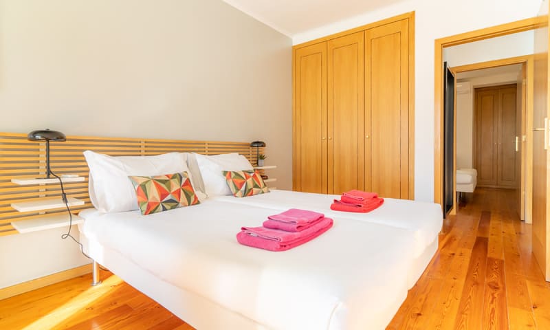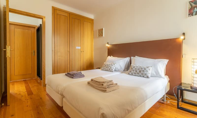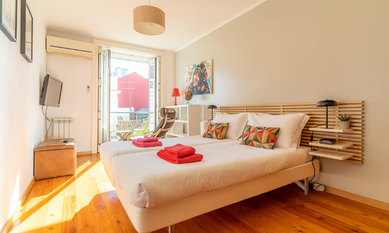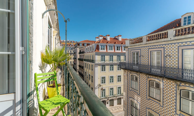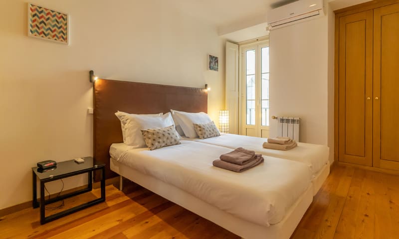 LV Premier Baixa LisbonSun PR2 is a popular 2 Bedroom apartment, featuring a beautiful balcony with city views. It is located on the 4th floor of an elevator building. The apartment is modern, and fully equipped including Air Conditioning and Central Heating. We are in the downtown area – Baixa, with many attractions within walking distance, as well as a wide choice of shops and restaurants. It accommodates 4 people in the bedrooms and a maximum of 1 extra guests in 1 folding bed. We have a second 2 bedroom apartment in the same floor- PR1 (perfect for larger families). 25843/AL