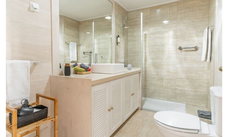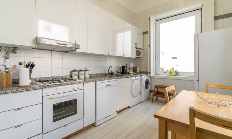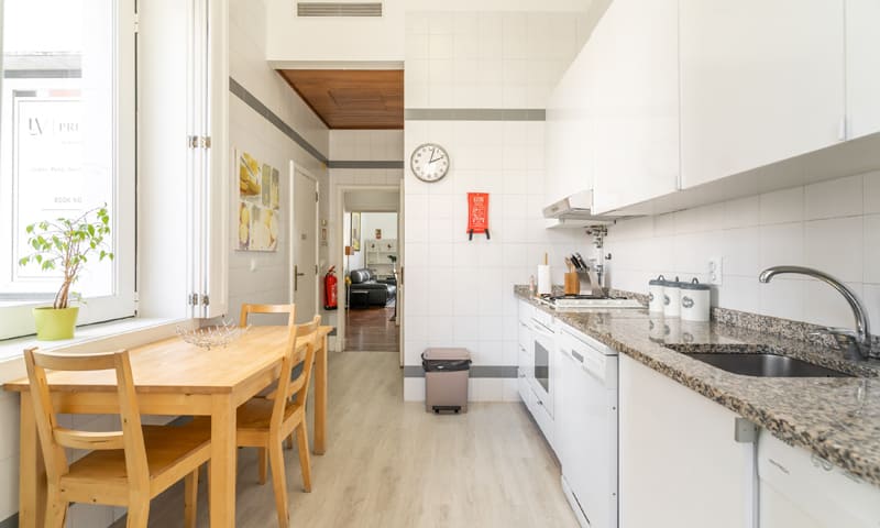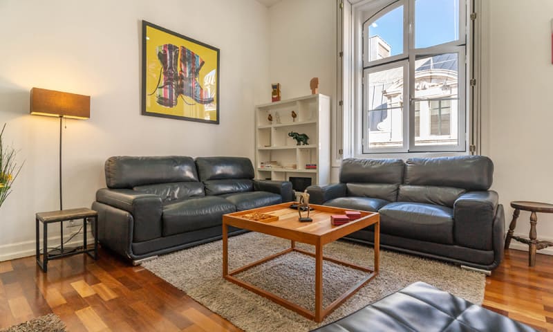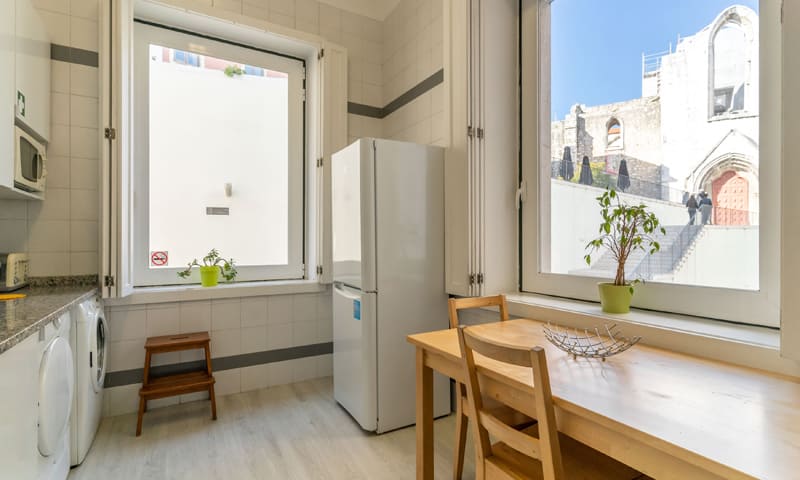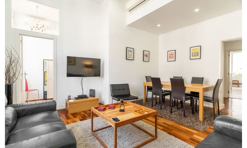 LV Premier Chiado Apartments – CH3 is a modern and very bright three bedroom apartment with two bathrooms. This vacation rental is one of 9 premium apartments located in the same elevator building, enabling rental of more than one unit. LV Premier Chiado – CH3 has just been refurnished and offers a contemporary, and very comfortable environment. It has high ceilings and large windows facing famous Rua do Carmo, with Armazéns do Chiado and elevador de Santa Justa right in front. The kitchen windows have awe inspiring views of Convento do Carmo with arches surviving the earthquake of 1755, as well as the newly built Carmo Gardens. Enjoy the unrivaled location with easy access to all amenities, restaurants, attractions, theaters and shops. The apartment is fully equipped and in addition to AC, it features heating and double-glazing windows. We can accommodate 7 people in the bedrooms and with sofa beds, a maximum of 9 guests. 8601/AL