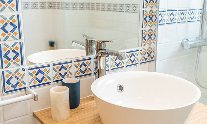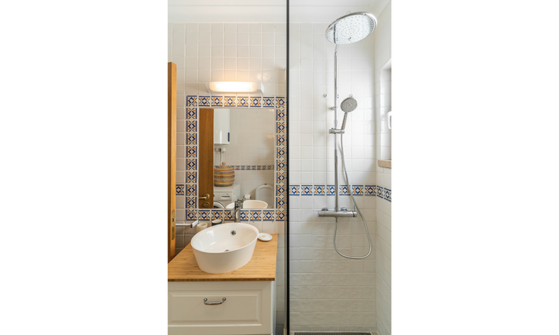 The living area features a comfortable seating area with a large TV and balcony access. The bathroom with shower. Soft bath towels, toiletries for your first day and of course a hair dryer are provided as a standard.
